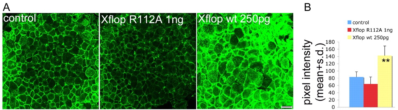 Fig. 7. Overexpression of an Xflop mutant (R112A) that lacks G-protein-coupling activity does not increase cortical actin assembly. (A) Alexa 488-conjugated phalloidin staining showing that overexpression of the R112A mutant (1 ng mRNA injected) does not mimic the capacity of wild-type Xflop to increase cortical actin assembly. (B) Quantitation by pixel intensity shows that R112A had no effect on cortical actin assembly. *, P<0.01. Scale bar: 50 μm.