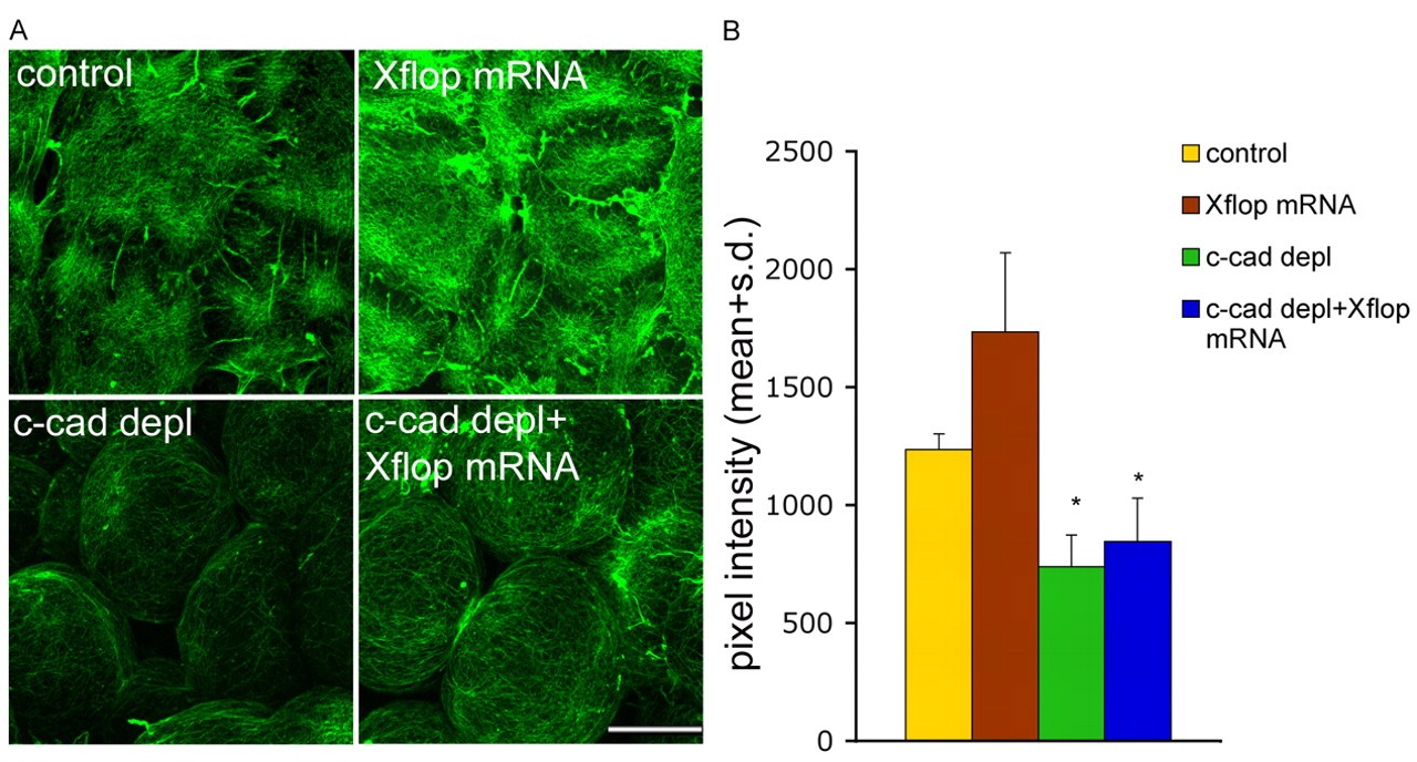 Fig. 9. Depletion of C-cadherin blocks Xflop-induced cortical actin assembly. (A) Alexa 488-conjugated phalloidin staining of F-actin shows that C-caderin depletion (c-cad depl) significantly reduces both endogenous and Xflop overexpression induced cortical actin assembly. (B) This notion is supported by pixel intensity quantitation. *, P<0.05. Scale bar: 50 μm.