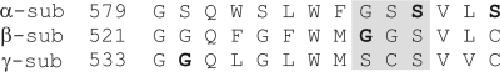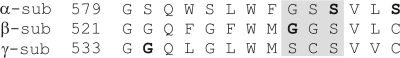 Figure 1. Sequence alignment of rat α, β, and γ subunits. The number of the start residue in the sequence is indicated. Residues mutated in this study are in bold. The region corresponding to the putative ENaC selectivity filter is shaded in gray.
