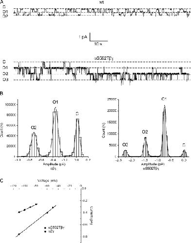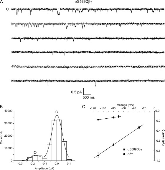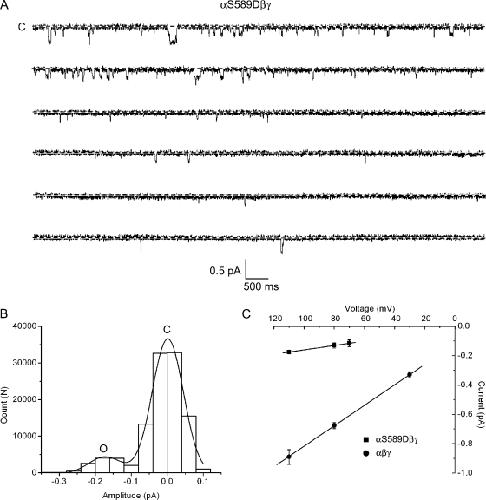 Figure 9. Single-channel properties of αS589Dβγ channels. Cell-attached patch recordings were taken from oocytes expressing αS589Dβγ channels. (A) An exemplar single-channel recording 60 s in duration from a patch containing an αS589Dβγ mutant. The pipet contained Li+ as the charge carrier and the pipet voltage was +110 mV. (B) An all-points histogram was constructed from the single-channel recording obtained in A. The histogram was fit by two Gaussian functions corresponding to a single closed and open conductance level. (C) The slope conductance of αS589Dβγ channels was obtained from the single-channel i-V relationship. Conductance was calculated to be 1.9 ± 0.1 pS for the mutant channel compared with 7.0 ± 0.1 pS for the wt channel.