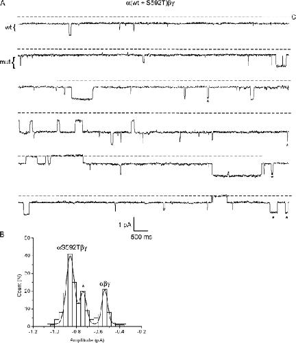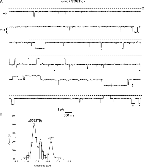Figure 3. Coexpression of wt and mutant αS592T subunits. Oocytes were injected with α-wt and αS592T subunits, together with wt β and γ. (A) Six sequential 10-s segments of recording from a patch containing wt, mutant, and hybrid channels are shown. The pipet contained Na+ and the pipet voltage was +110 mV. The wt and mutant conductance levels are indicated by the brackets to the left of the trace. Openings that correspond to a hybrid conductance are marked by a star. (B) An event-amplitude histogram was constructed by measuring the size of every closed to open transition (described in Materials and Methods) from the entire recording in A. The histogram was fit by three Gaussian functions where the parameters were (mean ± SD): −0.54 ± 0.03, −0.86 ± 0.04, and −0.73 ± 0.03 pA (marked by star), for the wt, mutant, and hybrid conductances, respectively.