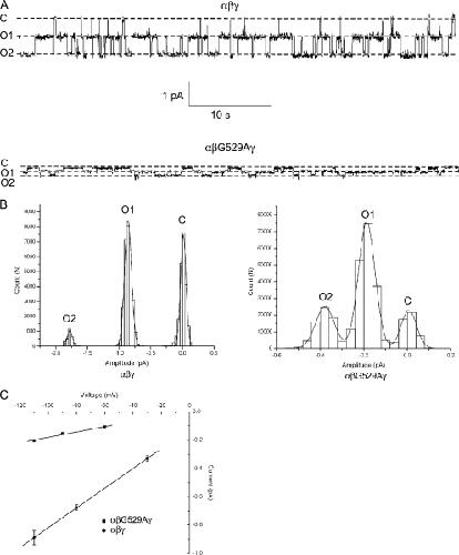 Figure 4. Single-channel properties of wt and αβG529Aγ channels with Li+ as the charge carrier. Cell-attached patch recordings were taken from oocytes expressing either wt or αβG529Aγ channels. (A) Exemplar single- channel traces of 60 s duration from patches containing wt or αβG529Aγ ENaC with LiCl in the pipet. The pipet voltage was +110 mV. Downward deflections correspond to movement of Li+ from the pipet to the cell from a fully closed (C) level to two open levels (O) as indicated. (B) All-points histograms were constructed from an ∼10-s region of the single-channel recordings obtained in A. The histograms were fit by three Gaussian functions corresponding to closed, one open, and two open levels. No subconductances were observed. (C) Slope conductances of wt and αβG529Aγ channels were obtained from single-channel i-V relationships as shown. Conductance was calculated to be 7.0 ± 0.1 pS for the wt channel and 1.9 ± 0.3 pS for the mutant channel.
