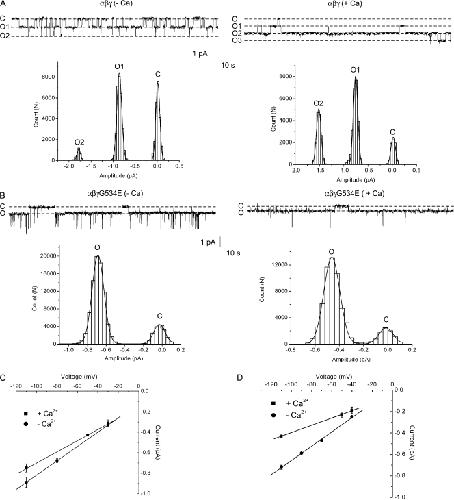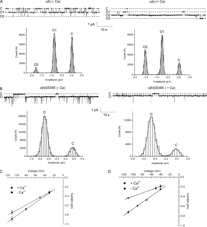 Figure 7. Single-channel properties of wt and αβγG534E channels. (A) Exemplar recordings taken from oocytes expressing wt channels with Li+ as the permeant ion, in the presence (+Ca) or absence (−Ca) of 2 mM Ca2+ in the pipet as indicated. In each case, all-points histograms were constructed from ∼10-s regions of the trace above. The histograms were fit by three Gaussian functions corresponding to one closed and two open (O) levels as indicated. No subconductance levels were observed. (B) Exemplar recordings taken from oocytes expressing αβγG534E channels with Li+ as the permeant ion, in the presence (+Ca) or absence (−Ca) of 2 mM Ca2+ in the pipet as indicated. Brief, large-amplitude transitions were noted during the recordings. We believe these are unlikely to represent ENaC and were ignored in the data analysis. For each trace, all-points histograms were constructed (from ∼10-s regions of recording) and fit by two Gaussian functions. No subconductance levels were observed. (C) Single-channel i-V relationship of wt channels with (+Ca) and without (−Ca) 2 mM Ca2+ in the pipet. The gLi of wt channels with Ca2+ was 5.5 ± 0.2 pS and without Ca2+ was 7.0 ± 0.1 pS. (D) The single-channel conductance (gLi) of αβγG534E channels with Ca2+ was 3.4 ± 0.1 pS and without Ca2+ was 6.7 ± 0.1 pS.