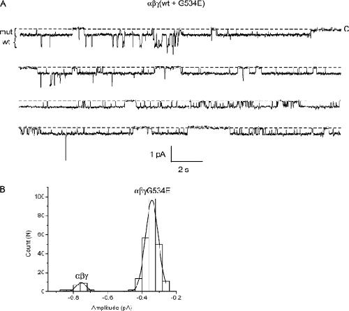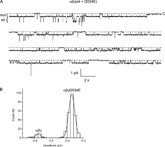 Figure 8. Coexpression of wt and mutant γG534E subunits. Oocytes were injected with γ-wt and γG534E subunits, together with wt α and β. (A) A continuous 80-s segment of a longer recording from a patch containing wt and mutant channels is shown. The pipet contained 110 mM Li+ and 2 mM Ca2+. The pipet voltage was 110 mV. The amplitude of wt and mutant conductance levels are indicated by brackets to the left of the trace. (B) An event-amplitude histogram was constructed by measuring the size of every open level transition for the full duration of the recording shown in A. The histogram was fit by two Gaussian functions with parameters (mean ± SD): 0.34 ± 0.04 and 0.76 ± 0.03 pA, corresponding to the mutant and wt conductance levels. Analysis of six other patches gave similar results.