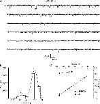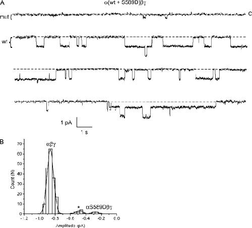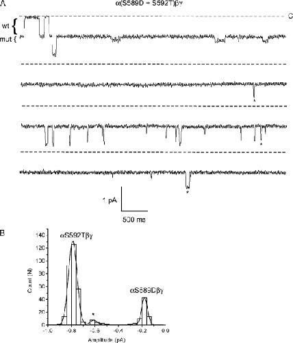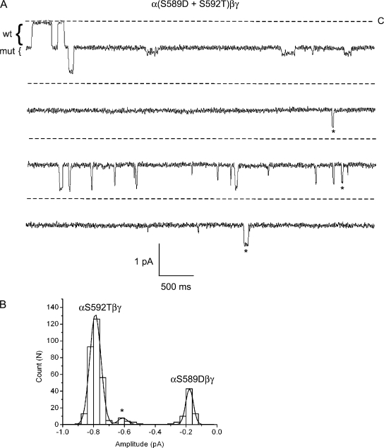 Figure 11. Coexpression of mutant αS589D and αS592T subunits. Oocytes were injected with αS589D and αS592T subunits, together with wt β and γ. (A) Four, 5-s segments of a longer recording containing mutant, wt, and hybrid channels in the patch are shown. The brackets to the left of the traces indicate the approximate amplitudes of wt and mutant channels. Li+ was the charge carrier, and the pipet voltage was 110 mV. Stars denote openings of a hybrid channel. (B) An event-amplitude histogram was constructed from this recording and was fit by three Gaussian functions with parameters (mean ± SD): 0.18 ± 0.03, 0.79 ± 0.04, and 0.61 ± 0.03 pA, corresponding to the αS589D, αS592T, and hybrid conductance levels, respectively.