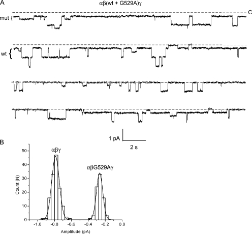 Figure 5. Coexpression of wt and mutant βG529A subunits. Oocytes were coinjected with β-wt and βG529A subunits, together with wt α and γ. (A) An 80-s segment of recording taken from a patch containing wt and mutant channels is shown. The pipet contained Li+ and the pipet voltage was +110 mV. The amplitude of wt and mutant conductance levels are indicated by brackets to the left of the trace. (B) An event-amplitude histogram was constructed by measuring the size of every closed to open transition for the recording with the most events shown in A (bottom trace). The histogram was fit by two Gaussian functions with parameters (mean ± SD): 0.28 ± 0.04 and 0.79 ± 0.05 pA, corresponding to mutant and wt conductance levels, respectively. Analysis of six other recordings gave similar results.