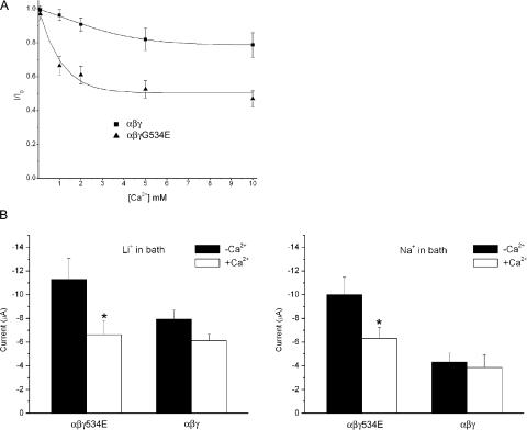 Figure 6. Macroscopic current in oocytes expressing αβγG534E channels is inhibited by Ca2+. (A) Two-electrode voltage clamp was used to generate a dose–response curve showing the effects of increasing [Ca2+]ex on ILi in wt and αβγG534E channels. 100 μM amiloride was applied at the end of each recording to correct for amiloride-insensitive current. (B) Current is inhibited to a similar extent by 2 mM Ca2+ whether Li+ or Na+ is in the extracellular solution. *, statistically significant compared with current (ILi or INa) in the absence of Ca2+ (P < 0.05). Data presented as mean ± SEM for 7–12 oocytes.