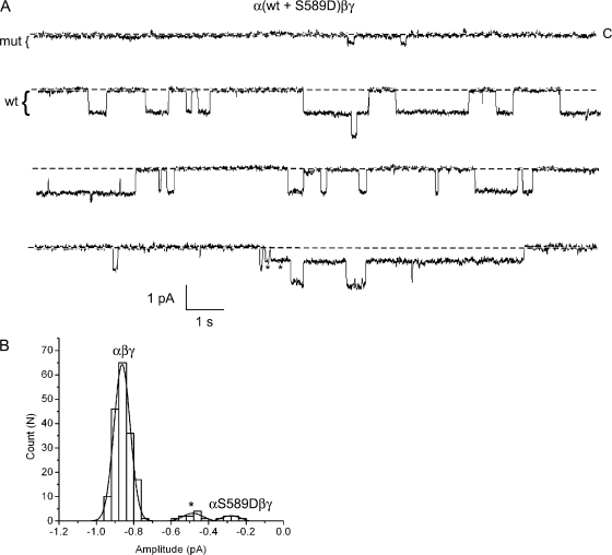 Figure 10. Coexpression of wt and mutant αS589D subunits. Oocytes were injected with α-wt and αS589D subunits, together with wt β and γ. (A) Four, 15-s segments of a longer recording containing mutant, wt, and hybrid channels in the patch are shown. Li+ was the charge carrier, and the pipet voltage was 110 mV. The brackets to the left of the traces indicate the approximate amplitude of the wt and mutant channels. Stars denote openings that correspond to a hybrid conductance. (B) An event-amplitude histogram was constructed from this recording and was fit by three Gaussian functions with parameters (mean ± SD): 0.28 ± 0.06, 0.86 ± 0.04, and 0.48 ± 0.05 pA, corresponding to the mutant, wt, and hybrid conductance levels, respectively.