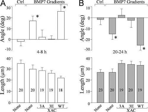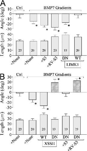 Figure 7. BMP7-induced bidirectional turning of the growth cones depends on the phosphorylation regulation of ADF/cofilin activity. (A and B) Mean turning angles (top) and lengths of net extension (bottom) of different groups of the growth cones examined in 4–8-h cultures (A) and overnight cultures (B). Numbers indicate the total numbers of growth cones examined for each condition. Asterisks indicate significant differences from the corresponding control group (*, P < 0.01; Mann-Whitney test). Error bars represent SEM. |