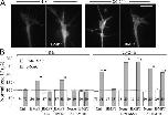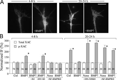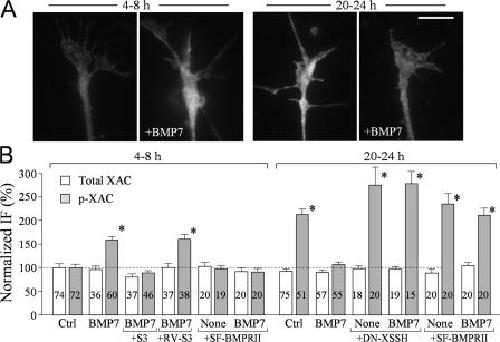 Figure 5. LIMK and SSH control the phosphorylation of ADF/cofilin in response to BMP7. (A) Representative fluorescent images of Xenopus growth cones of 4–8-h and overnight cultures that were immunostained with a specific antibody against p-XAC without and with bath BMP7 treatment (5 nM for 10 min). (B) Normalized levels of p-XAC and XAC in Xenopus growth cones of 4–8-h cultures and overnight cultures with and without bath BMP7 exposure (5 nM for 10 min) under different treatments. The numbers of growth cones examined for each condition are indicated on the bars. Asterisks indicate values that were significantly different from the control (*, P < 0.01; t test). Error bars represent SEM. Bar, 10 μm. |