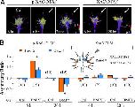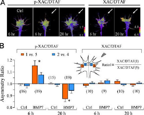 Figure 6. Spatial pattern of p-XAC in the growth cone exposed to a BMP7 gradient. (A) Representative ratiometric images of p-XAC/DTAF in a 6-h control growth cone and 6- and 20-h growth cones exposed for 5 min to a BMP7 gradient (arrows). Similar ratiometric images of total XAC/DTAF are also shown on the right. (B) Quantitative measurements of the asymmetry of p-XAC/DTAF and XAC/DTAF using the five-box analysis method. Only the formula for ratio 1 is depicted for simplicity. A ratio close to 1 indicates no asymmetry, a ratio above 1 indicates an asymmetry with the higher level on the near side of the growth cone (close to the pipette), and vice versa. Numbers in parentheses indicate the numbers of growth cones examined for each condition. Asterisks indicate significant differences from the control (*, P < 0.01; t test). Error bars represent SEM. |
