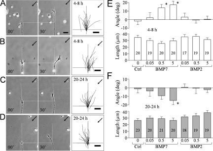 Figure 1. Bidirectional responses of nerve growth cones to BMP7 at different times in culture. (AâD) Representative phase-contrast images showing the turning responses of Xenopus growth cones from 4â8-h cultures (A and B) or overnight (20â24 h) cultures (C and D) at the onset (0 min) and end of 30 min of exposure to a BMP7 gradient (5 μM in pipette; B and D) or a control saline (A and C). Only the growth cone and part of its adjacent neurite are shown in the image. Scattered yolk granules (small bright objects) are present in each image and can be used as fiduciary markers. Horizontal dotted lines show the position of the growth cone at the onset of the turning assay. Vertical dashed lines show the original trajectory of the growth cone (determined from the growth cone and the adjacent 20 μm of neurite). Arrows indicate the direction of the gradient. Numbers indicate the time after the onset of the gradient. The overall responses of all of the growth cones in each group are depicted by the composite tracings of the trajectory of neurite extension of each growth cone during the 30-min turning assay. The origin is the center of the growth cone at the onset of the gradient, and the original direction of growth cone extension is vertical. (E and F) Mean turning angles (top) and lengths of net growth cone extension (bottom) of different groups of growth cones examined in 4â8-h cultures (E) or 20â24-h cultures (F). BMP concentrations are shown as micromolars in the pipette. The numbers of growth cones examined for each condition are shown on the bars. Asterisks indicate significant differences from the corresponding control (*, P < 0.05; Mann-Whitney test). Error bars represent SEM. Bars, 20 μm. |
