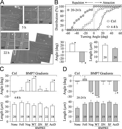 Figure 2. Double turning responses of the same growth cone at different times and the involvement of BMP receptors. (A) Representative images showing the turning responses of the same Xenopus growth cone at 5 (paired panels on the top right) and 22 h (paired panels at the center left) after plating (5 μM BMP7 in pipette). Dotted lines indicate the corresponding positions of the growth cone at the onset of the turning assay, dashed lines indicate the original directions of growth cone extension, and arrows point to the BMP7 gradient. Irregular-shaped low magnification images were stitched together to show the cell body, its neurites, and its location on the grid. (B) Quantitative analysis of the turning responses from 20 growth cones subjected to the double turning assay. The cumulative histogram in the top panel shows the distribution of the turning angles for these growth cones. Each point represents the percentage of growth cones with final turning angles equal to or less than the values indicated on the abscissa. The control curve is from the 6-h group shown in Fig. 1. The mean turning angles and lengths of growth cone extension from these 20 growth cones are shown in the bottom panel. (C and D) BMPRII mediates BMP7 attraction in 4–8-h cultures (C) and repulsion in overnight cultures (D). The mean turning angles (top) and lengths of growth cone extension (bottom) are shown in the bar graphs. The number of growth cones examined in each group is indicated in the length bar graphs. Asterisks indicate significant differences compared with the corresponding control (*, P < 0.05; Mann-Whitney test). Ctrl, control; Foll, follistatin; Nog, noggin; WT, wild type; DN, dominant negative; SF, short form; ActD, actinomycin D. Error bars represent SEM. Bars, 20 μm. |