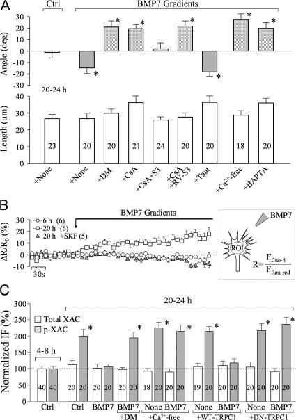 Figure 8. BMP7-induced repulsion in overnight neurons requires Ca2+–CaN signaling. (A) Mean turning angles (top) and lengths of net extension (bottom) of different groups of growth cones examined in overnight cultures. DM, deltamethrin; CsA, cyclosporine A; Taut, tautomycin. The bars filled with a pattern show the turning responses switched from repulsion to attraction. Asterisks indicate statistical significances compared with the control (*, P < 0.01; Mann-Whitney test). (B) Ratiometric imaging of changes in [Ca2+]i upon the onset of BMP gradients. The graph depicts the relative changes in fluo-4 and fura red ratios (ΔR/R0). The numbers in parentheses indicate the numbers of growth cones examined for each condition. 2 μM SKF96365 was added to the bath 20 min before imaging. The increase in ΔR/R0 became statistically significant 1 min after the onset of the BMP gradient (P < 0.05; t test). ROI, region of interest. (C) Normalized levels of p-XAC and XAC in Xenopus growth cones of 4–8-h cultures and overnight cultures with and without bath BMP7 exposure (5 nM for 10 min) under different manipulations of the Ca2+ signaling pathway. Asterisks indicate values that are significantly different from the control (*, P < 0.01; t test). (A and C) The numbers of growth cones examined for each condition are shown on each bar. Error bars represent SEM. |