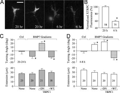 Figure 9. Xenopus TRPC1 coupling the Ca2+–CaN–SSH pathway to BMP7 signaling for growth cone repulsion. (A) Representative fluorescence images of 6- or 20-h cultured Xenopus growth cones stained with a specific antibody against Xenopus TRPC1. (B) Normalized levels of Xenopus TRPC1 expression in Xenopus growth cones of 6- and 20-h cultures. The asterisk indicates statistical significance (*, P < 0.01; t test). (C and D) Mean turning angles (top) and lengths of net extension (bottom) of different groups of growth cones examined in overnight cultures (C) and 4–8-h cultures (D). The bars filled with a pattern show the turning responses switched from the original one (repulsion to attraction in overnight cultures and attraction to repulsion in 4–8-h cultures). Asterisks indicate significant differences from the corresponding control (*, P < 0.01 compared with the control). (B–D) The numbers of growth cones examined in each condition are shown on the bars. Error bars represent SEM. Bar, 10 μm. |