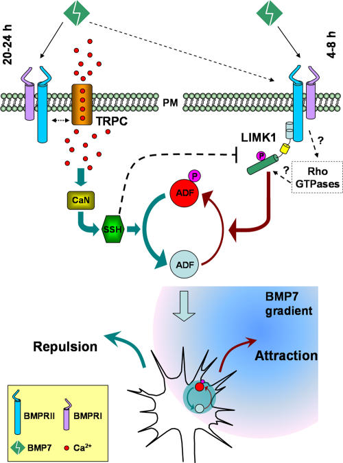 Figure 10. Schematic diagram illustrating the signaling mechanisms that control the bidirectional responses of the growth cone to BMP7 gradients. In 4â8-h neurons, BMP7 induces an attractive response through the LIMK pathway. In overnight neurons, BMP7 repels the growth cone through the CaNâSSH phosphatase pathway, which is activated by Ca2+ signaling through TRP channels. ADF/cofilin acts as the common downstream target of these two signaling pathways to locally regulate the actin cytoskeleton for distinct turning responses. PM, plasma membrane. |
