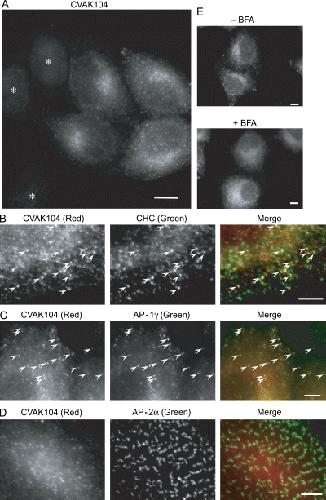 Figure 2. Immunolocalization of CVAK104.A) HeLa cells were either treated with siRNA against CVAK104 or untreated (control), then mixed and labelled with anti-CVAK104 antibody. Asterisks indicate CVAK104-depleted cells. Scale bar: 10 μm. B–D) Double labelling for CVAK104 and coat proteins. B) HeLa cells were double labelled for CVAK104 and CHC. The two patterns show significant colocalization. C) HeLa cells were double labelled for CVAK104 and AP-1 γ. Again the two patterns show significant colocalization. D) HeLa cells were double labelled for CVAK104 and AP-2 α. The two patterns show no significant colocalization. Scale bars: 5 μm. E) HeLa cells were treated with BFA (20 μg/mL) for 5 minutes at 37 °C or treated with medium only (control), and labelled with anti-CVAK104 antibody. Upon BFA treatment, CVAK104 loses its membrane association and becomes largely cytosolic. Scale bars: 10 μm. CHC, clathrin heavy chain. Arrowheads indicate areas of colocalisation.