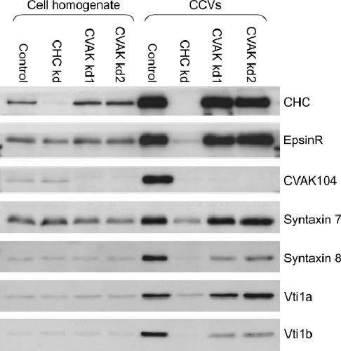 Figure 4. CVAK104 kd results in specific depletion of syntaxin 8 and vti1b from CCVs.Cell homogenates and CCV fractions were prepared from control and siRNA-treated cells and analysed by Western blot. CVAK kd1 and CVAK kd2 denote samples from two independent kd experiments. Approximately 10 μg protein of whole cell lysates or 2.5 μg of CCV fractions were loaded in each lane. Although the four SNAREs, syntaxin 7, syntaxin 8, vti1a, and vti1b, are all sorted by clathrin, only syntaxin 8 and vti1b are depleted from CCVs in a CVAK104 kd. CHC, clathrin heavy chain; kd, knockdown.
