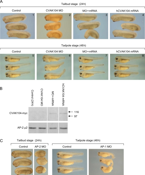 Figure 6. CVAK104 knockdown and rescue in Xenopus.A) Fertilized X. tropicalis eggs were injected with a control MO (panels 1 and 5) or a MO against CVAK104 (panels 2 and 6) at the one-cell stage and imaged either 24 h or 48 h post-fertilization. To rescue the knockdown phenotype, fertilized eggs were injected with anti-CVAK104 MO + mRNA encoding human CVAK104-myc (panels 3 and 7), then imaged either 24 h or 48 h post-fertilization. Expression of human CVAK104-myc resulted in high levels of rescue both at tailbud and tadpole stages. Expression of human CVAK104-myc alone had no apparent detrimental effects (panels 4 and 8). B) Western blots of extracts from 24 h embryos were probed with anti-myc antibody. AP-2 μ2 was included as a loading control. Human CVAK104-myc was detectable in embryos that had been injected with mRNA. C) Fertilized eggs were injected with either a control MO, a MO against AP-2 μ2, or a MO against AP-1 μ1A, then imaged either 24 h or 48 h post-fertilization. Both knockdowns cause severe phenotypes, but the AP-1 knockdown phenotype is more similar to the CVAK104 knockdown phenotype.