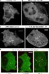 Figure 3. Live-cell imaging of tagged CVAK104 constructs.A and B) CVAK104 was tagged with GFP at the C-terminus and transiently expressed in HeLa cells. A) In control cells, CVAK104-GFP is present in small and highly mobile compartments. B) In clathrin-depleted cells, CVAK104-GFP is more cytosolic but also labels largely immobile vesicular compartments as well as mobile tubular structures (white arrows). C and D) The N-terminal kinase-like domain of CVAK104 was tagged with YFP and transiently expressed in HeLa cells. C) In control cells, the construct localizes to mobile tubular and vesicular structures. D) In clathrin-depleted cells, the construct localizes mainly to tubular mobile structures. E) CVAK104-GFP was transiently expressed in HeLa cells. Cells were allowed to endocytose pre-bound Alexa Fluor-labelled transferrin, and imaged either ∼1, ∼10 or ∼60 minutes after beginning of uptake by spinning-disk confocal microscopy. Frequent colocalization (white arrows) can be observed at early, but not at late stages of the experiment. Time-points 1 and 10 minutes show images of the same cell, taken from a continuous movie (Video S5). Representative still images are shown here; the corresponding movies are available as Videos S1–S6 (online supplemental material). Scale bars: 10 μm.