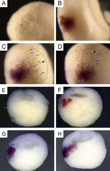 Figure 4. Range of Xlefty movement is not altered by glycosylation. AâH: Embryos co-injected with 250 pg of LacZ RNA plus or minus 150 pg of tagged or untagged RNAs encoding Xlefty and XleftyNGM-A and stained for Red-Gal and then Myc-immunostained. AâD: Dashed line, boundary of Red-Gal lineage-label-marked producer cell clone. Broken arrow, direction of vegetal pole. Specific Myc immunodetection signal is purple (arrowhead). Embryos were visualized externally after staining in whole-mount. Embryos were uninjected (A), or received 150 pg untagged Xlefty RNA (B), 150 pg Xleftymyc RNA (C), or 150 pg XleftyNGM-Amyc RNA (D). EâH: Embryos were bisected through the patch of Red-Gal staining before myc immunostaining. Embryos were uninjected (E) or received 150 pg untagged Xlefty RNA (F), 150 pg XleftyMyc RNA (G), or 150 pg XleftyNGM-Amyc RNA (H).