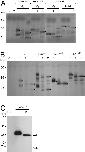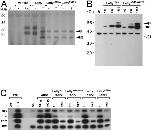 Figure 1. Glycosylation of Lefty molecules. A,B: Medium was analyzed from Xenopus oocytes injected with the indicated RNAs, metabolically labeled with [35S]-methionine/cysteine. Black dots, major glycosylated and deglycosylated bands. C: Western blot of conditioned medium from dissociated animal halves isolated from embryos injected at the one-cell stage with 2.5 ng of XleftyHA RNA. Un, uninjected oocytes or embryos; V, vehicle (1% DMSO); (â), oocytes not injected with tunicamycin, or conditioned medium not treated with PNGase F; T, tunicamycin; P, PNGase F; L, XleftyL (filled arrowhead); S, XleftyS (open arrowhead).Download figure to PowerPoint