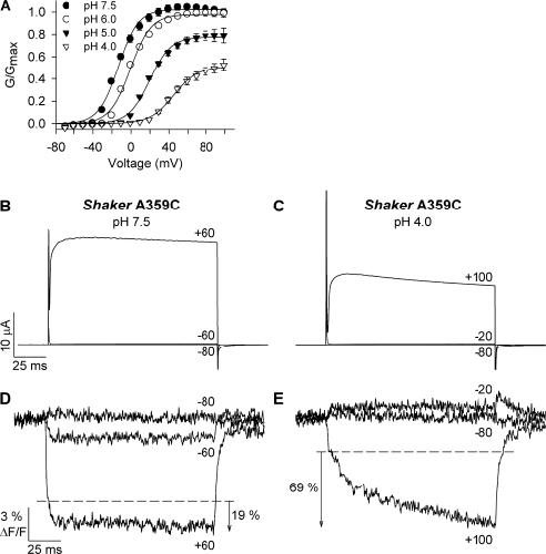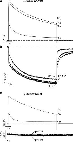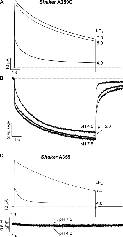 Figure 3. Acidic pH enhances the inactivation report from Shaker A359C. Typical ionic currents (A) and fluorescence signals (B) recorded from Shaker A359C channels during 7-s voltage-clamp pulses to +60 mV at the indicated external pH (holding potential of −80 mV). (C) Typical ionic currents and fluorescence signals recorded at pH 7.5 and pH 4.0 from TMRM-labeled channels in which a cysteine residue was not engineered at position A359 (Shaker A359). These channels lack an externally labelable cysteine residue (the only external cysteine, in the S1–S2 linker [C245], has been removed) and act as a control demonstrating the lack of a voltage-dependent fluorescence deflection in the absence of an introduced cysteine and also the pH independence of emission of the TMRM dye.