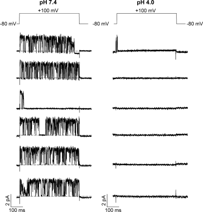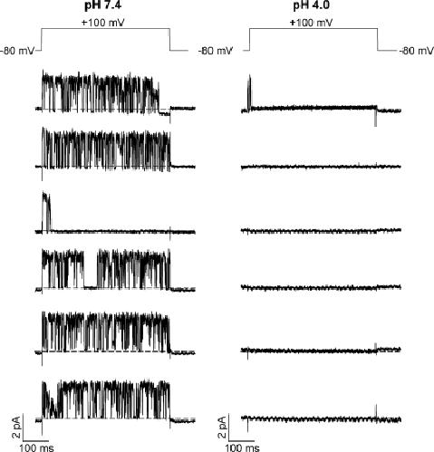 Figure 6. Acidic pH decreases open probability without altering single channel current amplitude. Typical recordings of single channel events obtained from outside-out patches of ltk− cells expressing Shaker Δ6–46 channels during consecutive 500-ms voltage-clamp pulses to +100 mV (pulse interval 15 s) from a holding potential of −80 mV (the voltage protocol is shown). In this example the patch contains a single channel. Channel activity from the same patch was recorded during control conditions (pH 7.4) and at pH 4.0. Dashed lines mark the zero current level. Acidic pH markedly reduced channel availability (calculated by determining the proportion of sweeps showing channel activity during the first 50 ms of the pulse) from 0.87 at pH 7.4 to 0.14 at pH 4.0 without effect on the single channel current amplitude. At +100 mV, the single channel current amplitude was 2.7 ± 0.3 pA at pH 7.4 and 2.7 ± 0.3 pA at pH 4.0 (data were collected from 11 patches at pH 7.4 and 5 patches at pH 4.0). The 84% reduction in channel availability (from 0.87 to 0.14) was greater than the reduction of macroscopic conductance measured from Shaker channels expressed in Xenopus oocytes (Fig. 1), but similar to the decrease in peak macroscopic current measured from Shaker channels expressed in mammalian cells at pH 4.0 (91 ± 8%; n = 5). This difference between expression systems is most likely due to incomplete exchange of solution over the entirety of the large invaginated oocyte membrane.