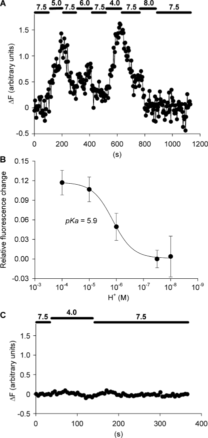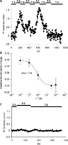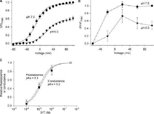 Figure 13. Demonstration of pH-induced closed-state rearrangements. Typical diary plots of the effect of changing the pH on the fluorescence emission from Shaker ILT S424C (A) or Shaker A359 (C, as a control) channels held continuously at −80 mV. To minimize bleaching of the fluorophore, fluorescence was sampled every second (although only every fifth recording is shown for clarity) by opening the shutter for 100 ms. Low pH induced rearrangements at −80 mV that were detected by TMRM at S424C. (B) Plot of the dependence of the closed-state fluorescence changes on the external pH (n = 3). The relative fluorescence change from that at pH 7.5 is plotted. Data were fitted with a standard Hill equation (assuming a Hill coefficient, n, of 1). The pKa for the closed-state fluorescence change was pH 5.9. The value at pH 7.5 represents the mean of all pre- and post-treatment conditions since the order of pH changes was not necessarily consistent.