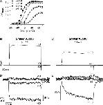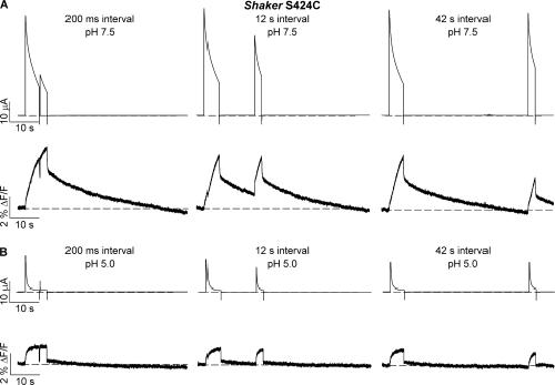 Figure 8. Low pH enhances P-type inactivation. Typical ionic currents and fluorescence signals recorded at pH 7.5 (A) and pH 5.0 (B) from Shaker S424C channels during a 2-s test pulse to +60 mV applied either 200 ms, 12 s, or 42 s after a 5-s conditioning pulse to +60 mV (holding potential −80 mV). Similar records were obtained from five other oocytes.