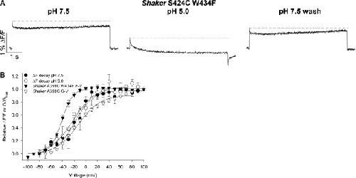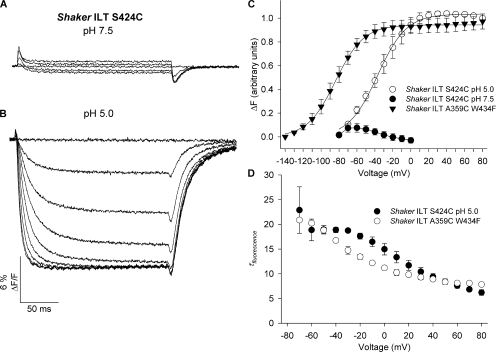 Figure 12. Acidic pH induces conformational changes in closed channels that are associated with inactivation. Typical fluorescence signals recorded from Shaker ILT S424C channels during 100-ms voltage pulses from −80 to 0 mV at pH 7.5 (A) and from −80 to +80 mV at pH 5.0 (B). Although pulses were applied in 10-mV increments, only every other pulse is shown for clarity. A voltage pulse to 0 mV at pH 7.5 or to +80 mV at pH 5.0 (shift in voltage dependence is due to surface charge screening by protons) evokes maximum voltage sensor movement without any channel opening. Reduction of the extracellular pH induced conformational changes in closed channels that are consistent with inactivation. (C) Mean F-V relationships of the fluorescence recorded from closed channels at pH 7.5 and pH 5.0 from Shaker ILT S424C channels (n = 4), and from Shaker ILT A359C W434F channels (n = 4). The V1/2 and k values were −37.1 ± 0.8 mV and 16.1 ± 0.7 mV for Shaker ILT S424C channels at pH 5.0, and −83.0 ± 0.4 mV and 15.7 ± 0.4 mV for Shaker ILT A359C W434F channels at pH 7.5, respectively. (D) Mean τ-V relationships for the fast phase (fitted with a single exponential) of the fluorescence deflection from Shaker ILT S424C channels at pH 5.0, and from Shaker ILT A359C W434F channels (n = 4). The voltage dependence and kinetics of the fluorescence report from Shaker ILT S424C channels was similar to that of voltage sensor movement reported by Shaker A359C W434F.
