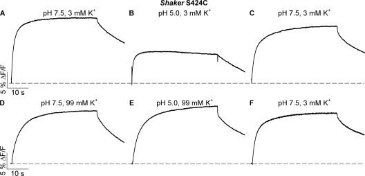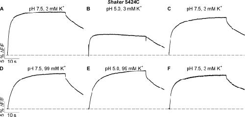 Figure 10. Inhibition of inactivation by raising external K+ rescues the loss of fluorescence at low pH. (A–F) Typical fluorescence signals recorded from the same oocyte expressing Shaker S424C channels during 42-s depolarizing pulses to +60 mV during the indicated manipulations of the external K+ and proton concentration. After control fluorescence recordings were obtained with 3 mM K+ and pH 7.5 (A), the pH was reduced to pH 5.0 (with 3 mM K+) to demonstrate the decrease of fluorescence (B). Fluorescence signals were then recorded on return to pH 7.5 with 3 mM K+ (C) before application of solution with 99 mM K+ at pH 7.5 (D). The fluorescence was then measured with 99 mM K+ and pH 5.0 (E), before the oocyte was washed with control solution (3 mM K+ and pH 7.5) again (F). Similar records were obtained from three other oocytes.