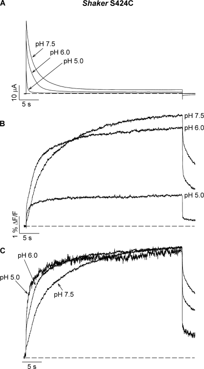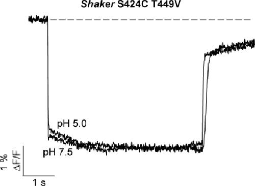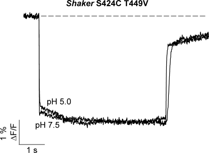 Figure 11. Inhibition of inactivation by the mutation T449V rescues the loss of fluorescence at low pH. Typical fluorescence signals recorded from Shaker S424C T449V channels during 7-s depolarizing pulses to +60 mV at pH 7.5 and pH 5.0 (holding potential −80 mV). Inhibition of inactivation prevented the loss of fluorescence at low pH.
