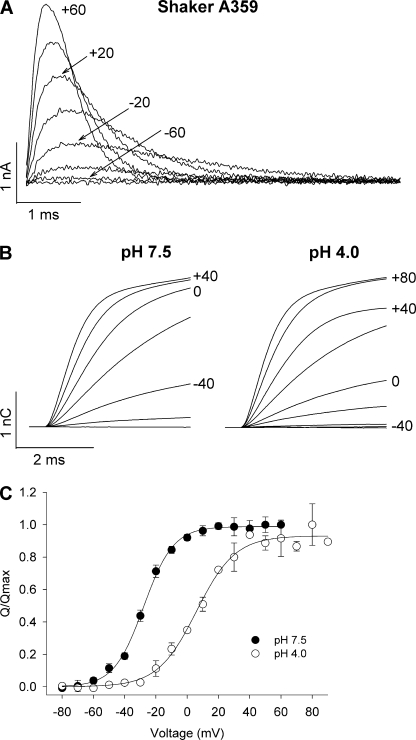 Figure 2. Acidic pH does not alter total gating charge movement in Shaker channels. (A) Typical wild-type Shaker Δ6–46 (Shaker A359) gating current records obtained from tsa201 cells in the whole-cell patch clamp configuration during 20-ms voltage-clamp pulses from −80 to +60 mV (in 10-mV increments) from a holding potential of −80 mV. Currents during every other pulse are shown for clarity and only the first 6 ms of the depolarizing pulses are shown to highlight the on-gating current. (B) Typical integrals of on-gating currents, such as those in A, recorded in the same cell under control conditions (pH 7.5) and at pH 4.0. Acidic pH did not alter the total gating charge movement in these channels. (C) Mean Q-V relationships recorded at pH 7.5 and pH 4.0 (n = 2–4). At pH 4.0, the Q-V relation was shifted by ∼+35 mV from −27.9 ± 0.4 mV at pH 7.5 to +5.9 ± 1.2 mV.