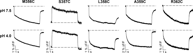 Figure 4. Voltage sensor detection of pH-induced enhancement of inactivation is site specific. Typical fluorescence signals from TMRM attached at different sites in the S4 voltage sensor and S3–S4 linker from M356C to R362C recorded during a 7-s pulse to +60 mV at pH 7.5 and pH 4.0 (holding potential −80 mV). Robust fluorescence deflections were recorded from each site in the scan with the exception of I360C and L361C, from which we were unable to record voltage-dependent fluorescence signals. Only A359C and R362C report the pH-induced enhancement of inactivation.