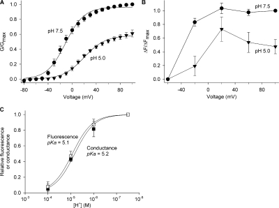 Figure 7. The loss of fluorescence at low pH is similar to the reduction of peak current amplitude. (A) G-V relations of Shaker S424C channels recorded with the indicated external pH (n = 3). Using Eq. 1 (the intracellular K+ concentration was assumed to be 99 mM), conductance was calculated from currents recorded during 100-ms voltage pulses applied from −80 to +100 mV at 10-s intervals in 10-mV increments (holding potential −80 mV). (B) F-V relations of the Shaker S424C channels recorded at the indicated pH during 42-s pulses from the same group of oocytes as A (n = 3). All fluorescence amplitudes were normalized to the fluorescence amplitude at +100 mV with pH 7.5. Lines represent no mathematical significance and are simply to guide the eye. The loss of fluorescence at low pH was similar to the decrease in conductance at all potentials. (C) Plot of the dependence on the external pH of Shaker S424C channel fluorescence amplitude at +60 mV or conductance at +60 mV (n = 2–7). Fluorescence and conductance values were normalized to those at pH 7.5. Conductance values were calculated from peak currents recorded at the same time as fluorescence deflections during 42-s pulses so as to directly compare the decrease in conductance with the loss of fluorescence from simultaneous measurements from the same oocyte. Data were fitted with a standard Hill equation (assuming a Hill coefficient, n, of 1). pKa values were 5.1 and 5.2 for the loss of fluorescence and reduction of conductance, respectively.