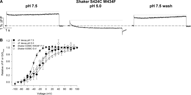 Figure 9. Low pH enhances C-type inactivation. (A) Typical fluorescence signals recorded from the same cell expressing Shaker S424C W434F channels during 7-s depolarizing pulses to +60 mV (applied after at least 3 min at the holding potential of −80 mV) at pH 7.5, pH 5.0, and on return to pH 7.5. Oocytes were held at −80 mV for 3 min between measurements. The W434F mutation permanently P-type inactivates channels enabling observation of C-type inactivation rearrangements during depolarizing pulses. The amplitude of the decaying component of fluorescence was approximately twofold larger at pH 5.0 than at pH 7.5. The dotted lines highlight the extent of the decay. The decay of fluorescence was biexponential with τ values of 21 ± 1 ms and 1.8 ± 0.1 s at pH 7.5, and 21 ± 1 ms and 0.36 ± 0.03 s at pH 5.0 (n = 3; P < 0.001, paired t test, when compared with pH 7.5). (B) Plot of the voltage dependence of the amplitude of the decaying component of fluorescence that reflects C-type inactivation (n = 3). The amplitude of the decaying component was measured at each potential and normalized to that at +100 mV (ΔF decay). Also plotted is the G-V relationship of Shaker A359C channels and F-V relationship of Shaker A359C W434F channels for comparison of the voltage dependence of pore opening and voltage sensor movement, respectively (n = 5–21).