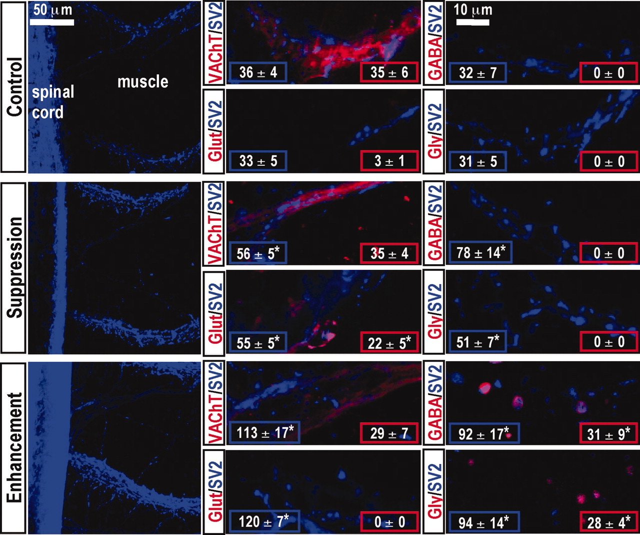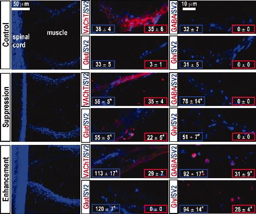 Fig. 2. Activity-dependent neurotransmitter expression in presynaptic terminals in the axial musculature. Whole mounts from control and activity-manipulated 3-day (stage 40) larvae were immunolabeled for a presynaptic marker, SV2 (in blue), and for transmitter phenotype (in red): VAChT (cholinergic), glutamate (glutamatergic), GABA (GABAergic), and glycine (glycinergic). (Left) Low magnification images are representative Z series projections obtained from confocal stacks of 50 optical sections of 44,100 μm2 area of muscle and spinal cord. (Center and Right) High magnification images are representative Z series projections of five optical sections of muscle from the top of the same stacks. n = 5 embryos for each transmitter phenotype. (Insets) Numbers of synaptic puncta labeled for SV2 and for transmitter per 33,443 μm2 area of muscle. Values are mean ± SEM for n = 5 single optical sections per probe from five embryos. â, P < 0.05 compared with control.