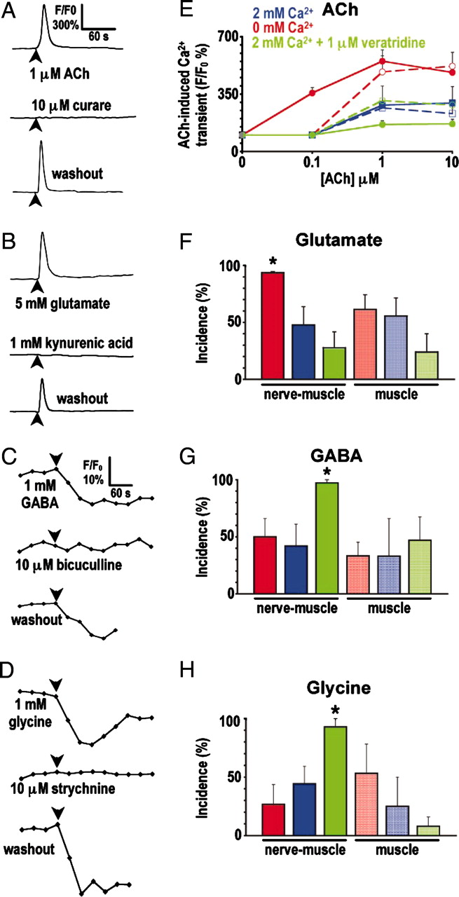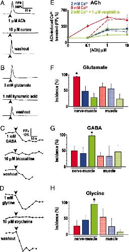 Fig. 4. Sensitivity of uninnervated muscle cells to ACh, glutamate, GABA, and glycine depends on neuronal Ca2+ spike activity in vitro. Muscle cells cocultured with neurons (nerve-muscle) and muscle cells cultured alone (muscle) for 18â24 h were loaded with a fluorescent Ca2+ indicator or Clâ sensor dye to image responses to ACh and glutamate or GABA and glycine, respectively. Imaging was performed in 2 mM Ca2+ culture medium. Glutamate responses were recorded in the presence of 10 μM curare or 3 μM pancuronium to exclude indirect nAChR-mediated responses. (AâD) Traces are responses of uninnervated single muscle cells to neurotransmitters applied at times indicated by arrowheads. (EâH) Analysis of the incidence of responses to transmitters under different culture conditions. â, P < 0.01 when compared with the 2 mM Ca2+ condition for nerve-muscle cultures. (E) Solid lines represent nerve-muscle cultures, and dashed lines represent muscle cultures. Values are mean ± SEM from >40 cells from five independent cultures for each transmitter.