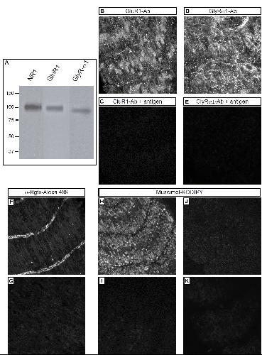 Fig. 5. Specificity of neurotransmitter receptor labeling in vivo. (A) Western blot with antibodies used for immunohistochemistry demonstrates bands of predicted molecular mass. Expected subunit receptor sizes are 102 kDa (NR1), 95 kDa (GluR1), and 89 (GlyRα1). (B-E) Staining of 1.3-day (stage 28) embryos with anti-GluR1 and anti-GlyRα1 is prevented by preincubation of the primary antibody with antigen. (F and G) Labeling of axial musculature by 5 mg/ml α-Bgtx-Alexa 488 in 3-day (stage 40) larvae (F) is blocked by 150 mg/ml cold α-Bgtx (G). (H-K) Labeling by 100 nM muscimol-BODIPY in stage 28 larvae (H) is blocked by 10 μM unlabeled muscimol (I), 20 μM bicuculline (J), or 20 μM gabazine (K).