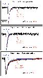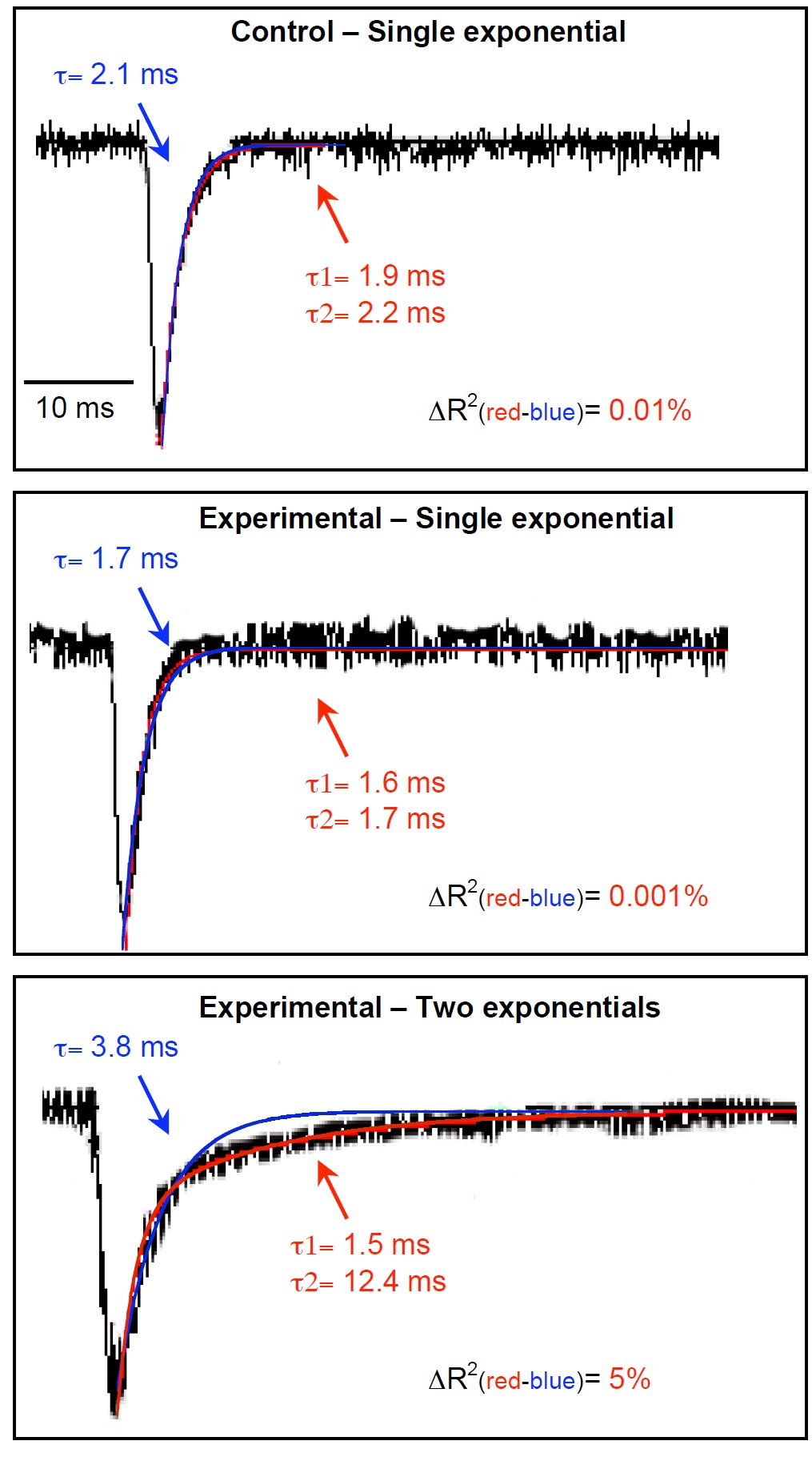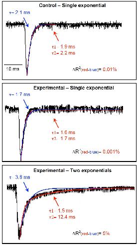 Fig. 6. Fit of mpscs decay times at neuromuscular junctions in vivo. Examples of mpscs taken from recordings (black traces) from control and experimental neuromuscular junctions of stage 40 larvae. Fits of decay times with one exponential (blue trace) and two exponentials (red trace) were performed with the MiniAnalysis Program (Synaptosoft Inc, Decatur, GA). Two exponentials were considered better than one when the change in R2 was >1%. Of the 54 neuromuscular junctions examined in experimental animals, 35 had both monophasic (mean of 82%) and biphasic (mean of 18%) responses, and the rest had monophasic responses alone. Neuromuscular junctions in control embryos did not exhibit biphasic responses.