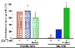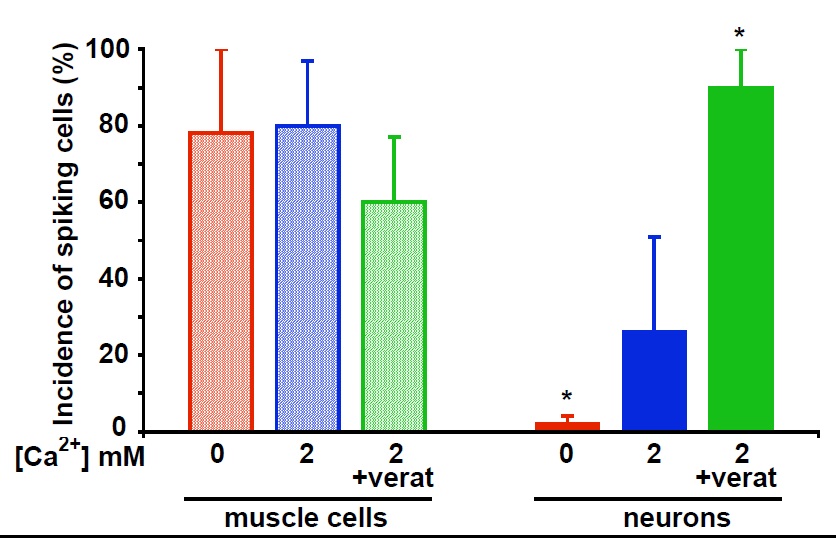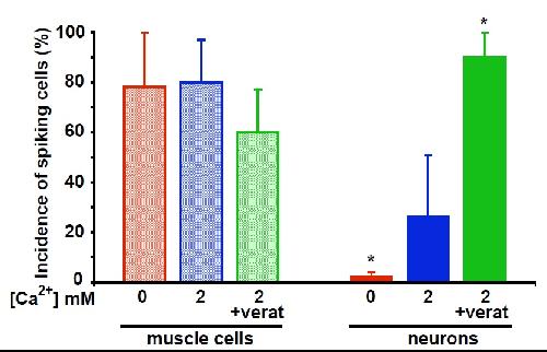 Fig. 7. The incidence of spontaneously generated Ca2+ transients in muscle cells cultured alone or with neurons is unaffected by conditions that alter neuronal Ca2+ spike activity. Cells were loaded with a Ca2+ sensor dye (2 μM Fluo-4AM) at 18-24 h in vitro and imaged at 0.2 Hz. The histograms illustrate the incidence of Ca2+ transients in muscle cells and neurons in Ca2+-free, 2 mM Ca2+, or 2 mM Ca2+ plus 1 μM veratridine medium. There was no difference between muscle cells cultured alone and those cocultured with neurons, and results are presented together. Values are mean ± SEM for >40 cells from five independent cultures for each group. *, P < 0.01 when compared to the 2 mM Ca2+ condition.