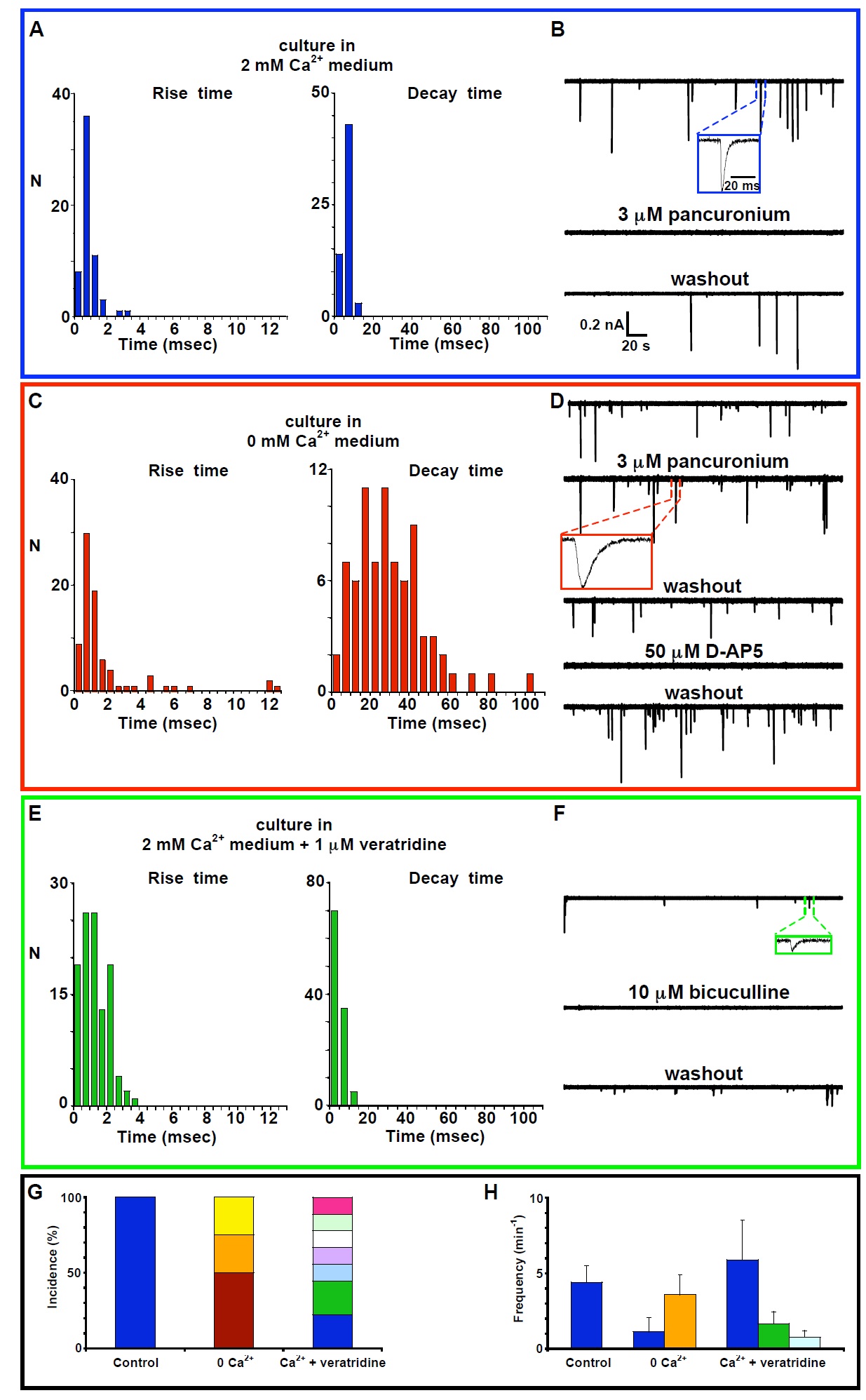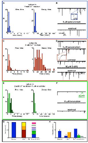 Fig. 9. Neuromuscular junctions formed in vitro are mediated by cholinergic and noncholinergic pairs of neurotransmitters and neurotransmitter receptors. Whole-cell recordings from innervated muscle cells were performed at 15-24 h in vitro in the presence of 2 mM Ca2+, Mg2+-free saline, and 3 μM TTX with Vh = -80 mV. (A, C, and E) Kinetic analysis of mpscs recorded from cells grown in Ca2+-free, 2 mM Ca2+, or 2 mM Ca2+ plus 1 μM veratridine medium. Only mpscs with decay times fit by single exponentials are included. (B, D, and F) Examples of recordings from neuromuscular junctions mediated by different transmitters and transmitter receptors. (G) Incidence of cholinergic, glutamatergic, GABAergic, and glycinergic neuromuscular junctions. Bars represent the percent of each class of neuromuscular junction. (H) Frequencies of mpscs. Values are mean ± SEM. (G and H) Blockers used to identify receptors: pancuronium (nAChR), kynurenate (iGluR), D-AP5 (NMDAR), bicuculline (GABAAR), and strychnine (GlyR). Blue, cholinergic; brown, glutamatergic; orange, NMDAergic; yellow, cholinergic plus NMDAergic; green, glycinergic; light-blue, GABAergic; purple, cholinergic plus GABAergic; white, GABAergic plus glycinergic; light green, cholinergic plus glycinergic; pink, cholinergic plus GABAergic plus glycinergic. Values are from three control (2 mM Ca2+ medium), four spike-suppressed (Ca2+-free medium), and nine spike-enhanced (Ca2+ plus veratridine medium) neuromuscular junctions.