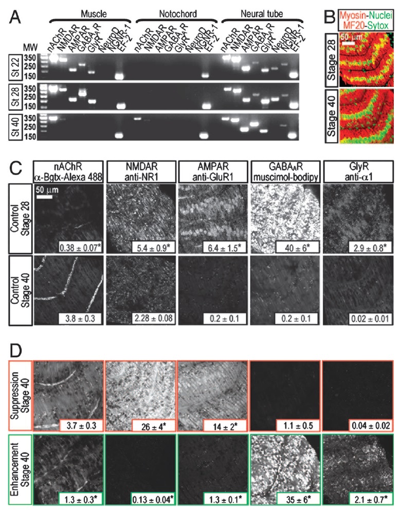 transcripts of five neurotransmitter receptors in muscle, notochord, and neural
