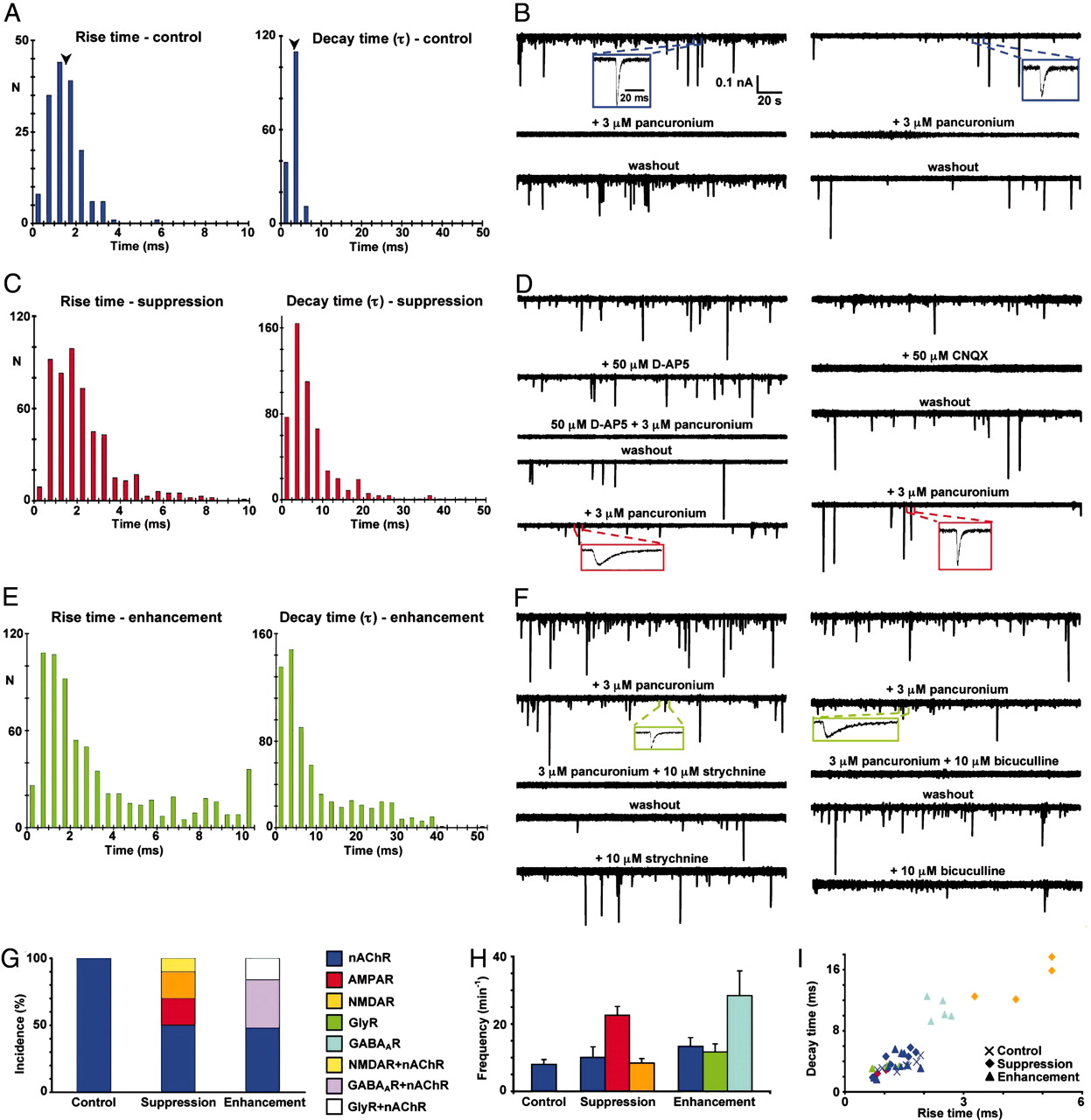 Fig. 3. Matching of neurotransmitters and receptors at neuromuscular junctions in vivo. Whole-cell recordings from muscle cells of the axial musculature of 3-day (stage 40) control (A and B), Ca2+ spike-suppressed (C and D), and Ca2+ spike-enhanced (E and F) larvae were performed in the presence of 2 mM Ca2+, Mg2+-free saline, and 3 μM TTX; V h = â80 mV. (A, C, and E) Rise and decay time distributions for mpscs, including only mpscs with decay times fit by single exponentials. N, number of mpscs (â¥6 embryos for each group). Arrowheads in A indicate mean values. (B, D, and F) Examples of pharmacological blockade of mpscs from two muscle cells in each group of embryos. Single mpscs are shown on an expanded time base to illustrate their kinetics. (G) Incidence of cholinergic, glutamatergic, GABAergic, and glycinergic NMJs. Bars represent the percent of each class of NMJ in each group based on blockade by different receptor antagonists. Bars represented by a single receptor are derived from NMJs in which mpscs were blocked completely by a single receptor antagonist. Bars corresponding to two receptors are derived from NMJs in which mpscs were blocked completely only by the combination of two receptor antagonists. (H) Frequencies of pharmacologically isolated mpscs in each group. Values are mean ± SEM. (I) Rise and decay times for pharmacologically identified mpscs. Ã, control; â, spike-suppressed; âµ, spike-enhanced. Each point is the mean rise time and decay time for mpscs recorded from a single muscle cell. (GâI) Values are from 6 control, 12 spike-suppressed, and 13 spike-enhanced NMJs.