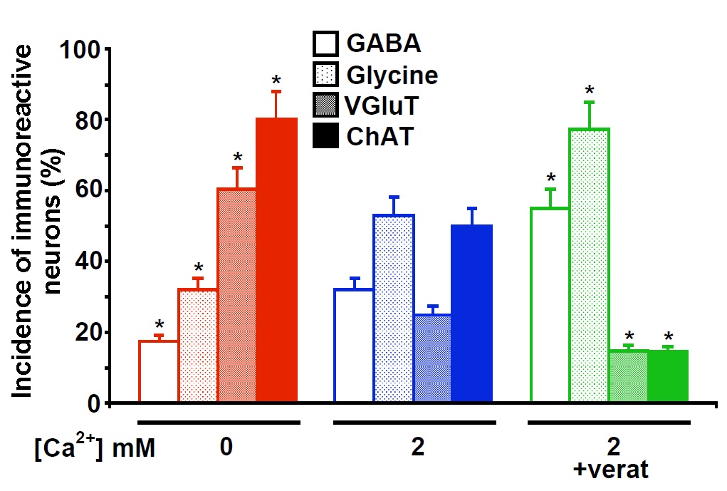 Fig. 8. Neurotransmitter expression in neurons cocultured with muscle cells is homeostatically regulated by neuronal Ca2+ spike activity. Nerve-muscle cocultures were grown in Ca2+-free, 2 mM Ca2+, or 2 mM Ca2+ plus 1 μM veratridine medium to alter neuronal Ca2+ spike activity. Cultures were fixed at 18 h and processed for immunocytochemistry. Values are mean± SEM for >40 neurons from five independent cultures for each group. *, P < 0.01 when compared to the 2 mM Ca2+ condition.