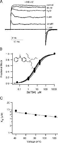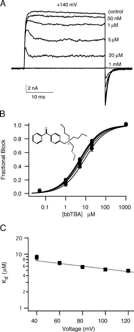 Figure 1. Macroscopic bbTBA blockade is dose and voltage dependent. (A) Representative family of steps from a holding potential of −80 mV to +140 mV (100 μM internal Ca2+) in the absence and presence of the indicated concentrations of bbTBA. Traces shown are averages of three consecutive sweeps. (B) Macroscopic fractional block (1 − IbbTBA/Icontrol) was measured from ionic currents, averaged across patches at six different voltages (+40 to +140 mV), and plotted against bbTBA concentration. Smooth curves are Hill fits to the average data (mean ± SEM; n = 6 patches). The structure of bbTBA is indicated in the inset; bbTBA carries a charge of +1. (C) Macroscopic Kds from Hill fits were plotted as a function of test voltage; error bars represent the standard deviation of the Hill fits in B. Parameters (±95% confidence interval) of bbTBA blockade derived from fitting of the data to Eq. 2 were (dashed line) Kd(0 mV) = 9.53 ± 3.32 μM, zδ = 0.148 ± 0.024.