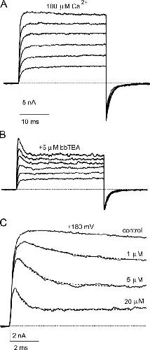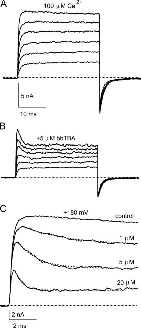 Figure 2. bbTBA blockade is time dependent. (A) Representative current families (averages of three consecutive sweeps) measured in 100 μM internal Ca2+ in the absence and (B) presence of 5 μM bbTBA. Test voltages ranged from +20 to +120 mV (in increments of 20 mV). Holding potential was −80 mV. In saturating Ca2+, the time-dependent component of block first becomes obvious at ∼+80 mV. (C) Average currents at +180 mV in the absence and presence of the indicated concentrations of bbTBA, on an expanded time scale. The time-dependent component of blockade is visible at bbTBA concentrations between ∼1 and 100 μM. The time constants of current relaxation in the presence of bbTBA measured from single exponential fits (dashed lines) were 3.71 ms (1 μM), 1.43 ms (5 μM), and 526 μs (20 μM). Note that the time constant of current relaxation decreases in rough proportion to the concentration of blocker applied, consistent with expectations of a two-state blocking reaction.