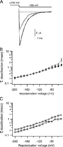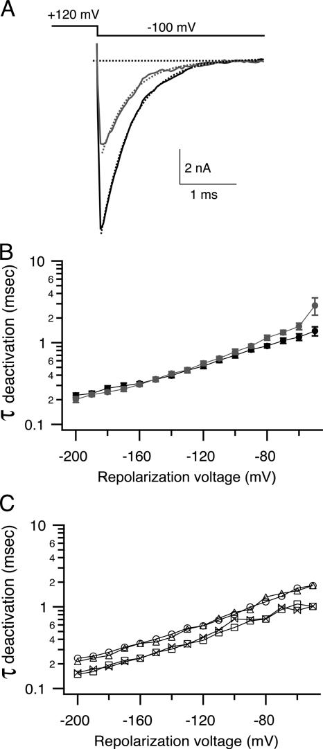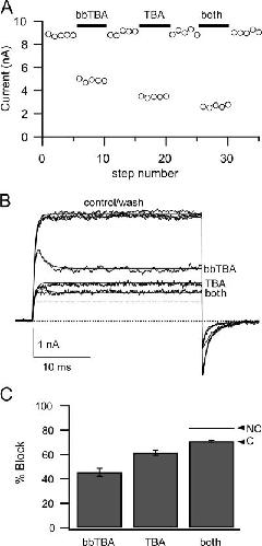 Figure 6. bbTBA does not interfere with closure of the activation gate. (A) An instantaneous IV protocol was used to measure rates of channel deactivation in the absence and presence of 5 μM bbTBA. Channels were maximally activated by a step from −80 to +120 mV, and then returned to a series of repolarization potentials ranging from −200 to −30 mV. Representative tail currents elicited by repolarization to −100 mV in the absence (black) and presence (gray) of 5 μM bbTBA are illustrated. Tail currents were fitted with single exponential functions (dashed lines) in order to obtain deactivation time constants. (B) Deactivation time constants from 14 patches in the absence (black) or presence (gray) of 5 μM bbTBA were averaged (±SEM) and plotted as a function of repolarization voltage. (C) Deactivation time constants from a single patch comparing control (circles) with 5 μM bbTBA (triangles), 1 mM TBA (squares), or both blockers together (bowties) illustrate the speeding effect of TBA on deactivation, which persists in the presence of both blockers. The mild slowing of deactivation kinetics at positive potentials can be explained by the tendency of channels at these potentials to close via the same two-step pathway that state-dependent models would require.