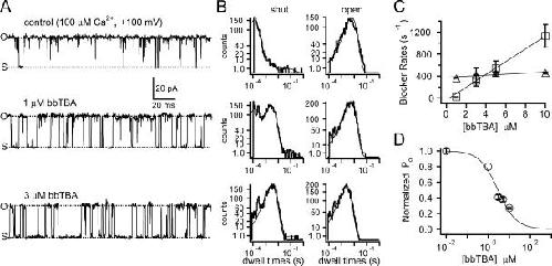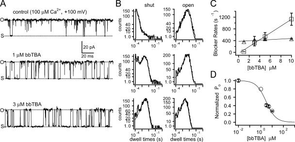 Figure 4. Kinetic and steady-state measurements of microscopic block at +100 mV are consistent with a bimolecular blocking reaction. (A) Representative single channel recordings (200 ms) measured at +100 mV in 100 μM internal Ca2+ in the absence or presence of the indicated concentration of bbTBA. The effective filtering frequency used for display purposes only was 1.96 kHz (for analysis of dwell times, records were sampled at 100 kHz and filtered at 10 kHz). Openings are upward. (B) Shut (left) or open (right) dwell time histograms were prepared from idealized records of control (top), 1 μM bbTBA (middle), or 3 μM bbTBA (bottom) data. Records were idealized with half amplitude threshold analysis using TAC software. Each histogram was constructed from 30–70 s of data, containing 1722–5081 events. Dwell times shorter than twice the filter dead time 2Td (76 μs) were excluded. Histogram data (gray) plotted as square root of counts vs. log of dwell times were fitted with single exponential functions (solid lines) in order to determine mean dwell times for each condition. (C) Average rates of block at +100 mV were calculated from the dwell time histograms and plotted as a function of bbTBA concentration. The off rate (kOFF, triangles) at each concentration of bbTBA was taken to be the reciprocal of the mean shut dwell time in blocker, assuming that excursions to the open level in the record largely reflect unblocking events. The first order on rate (kON, squares) was calculated at each concentration by subtracting the native closing rate, 1/β (the reciprocal of the control mean open time), from the reciprocal of the mean open time in bbTBA to prevent contamination of the calculated on rate by the intrinsic rate of channel closing. Data from three patches at +100 mV were averaged (±SEM) and fitted with linear equations to yield the second order association rate (±95% confidence interval) kON = 1.16 × 108 ± 0.258 × 108 M−1s−1. The dissociation rate (average of all values ± SEM) was kOFF = 435 ± 28 s−1, and the Kd (the intersection where kON = kOFF) was Kd = 3.9 μM. (D) Microscopic Kd was also obtained from steady-state measurements of open probability in various blocker concentrations. Open probabilities calculated from raw amplitude histograms were normalized, averaged, and plotted as a function of bbTBA concentration (n = 4 patches, ±SEM). The average data were fitted with the Hill equation, which yielded parameters (±95% confidence interval) Kd at +100 mV = 2.9 ± 5.5 μM and Hill coefficient of 1.0 ± 2.5. The linear increase in kON as a function of bbTBA concentration and the independence of kOFF are consistent with a bimolecular blocking reaction where a single bbTBA molecule binds at a single site.
